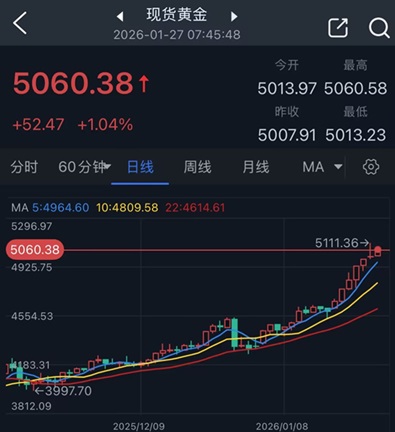 周二(1月27日)亚市早盘,现货黄金在隔夜纽约时段自高位大幅回落之后,突然出现暴涨行情。金价刚刚突破5060美元/盎司,日内涨幅超过52美元。美国总统特朗普最新表态称,美国对从韩国进口的汽车、药品和木材征收的关税将从15%上调至25%。分析师指出,在对关税的担忧情绪中,金价在亚洲早盘交易中上涨。