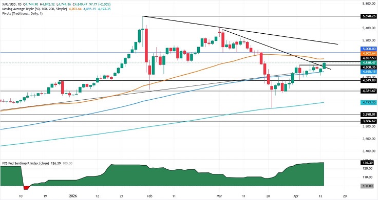 Valencia指出,黄金的上升趋势加速突破了4800美元/盎司关口,交易员目前在4857美元/盎司(即4月8日的日内高点)面临强劲阻力,紧随其后的阻力位是位于4896美元/盎司的50日简单移动平均线(SMA)。